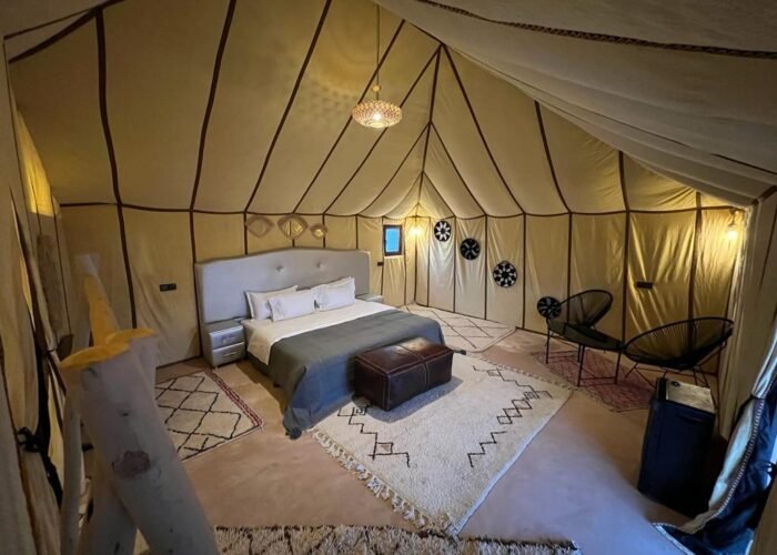 Sahara Dunes Camp is a small, family-run luxury camp built at the edge of those dunes, outside Merzouga in southern Morocco. We offer a handful of handcrafted Berber tents — each with a real bed, a private hot shower, and décor that reflects the heritage of the region. Every stay is all-inclusive: dinner, breakfast, camel or 4×4 transfer, campfire music, and the kind of hospitality that only a local-run camp can offer.