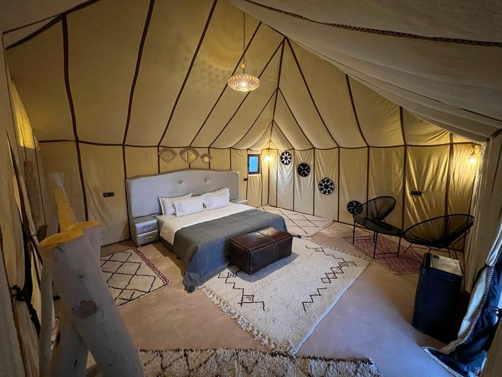 Our Luxury Double Occupancy tent blends traditional Berber craftsmanship with modern comfort. Each 26 m² tent features handwoven rugs, Moroccan lanterns, carved wood details, and a king bed dressed in premium cotton linens — a genuine reflection of Saharan heritage.